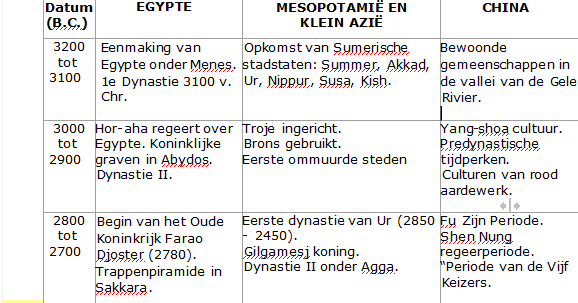 De zes oudste beschavingen die volgens de opgetekende geschiedenis een doorgaande en gevestigde cultuur hadden zijn: Sumerië (Mesopotamië), Egypte, China, Minoïsche, Indusvallei en het Heilige Land of Fenicië.