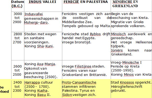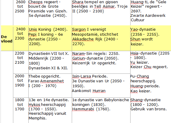 Tijdgrafiek van verschillende beschavingen die hun ononderbroken bestaan laat zien tot de tijd van de Grote Zondvloed in de tijd van Noach (2344 v. Chr.).